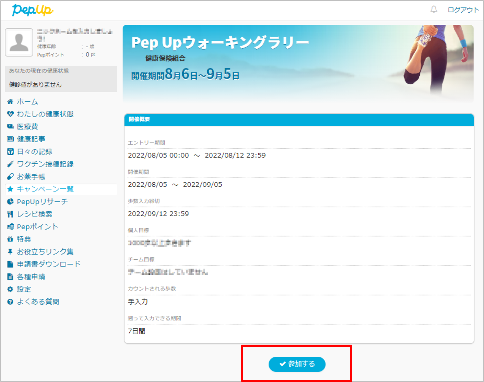 Pep Up内の「どけぽんウォーク2026春」のページにアクセスし、参加するを押す。